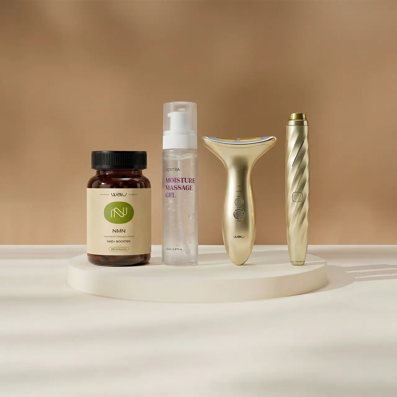 Эксклюзивная система омоложения, где каждый элемент усиливает действие другого: аппаратное воздействие на лицо и зону глаз, глубокое восстановление кожи, и замедление процессов старения изнутри