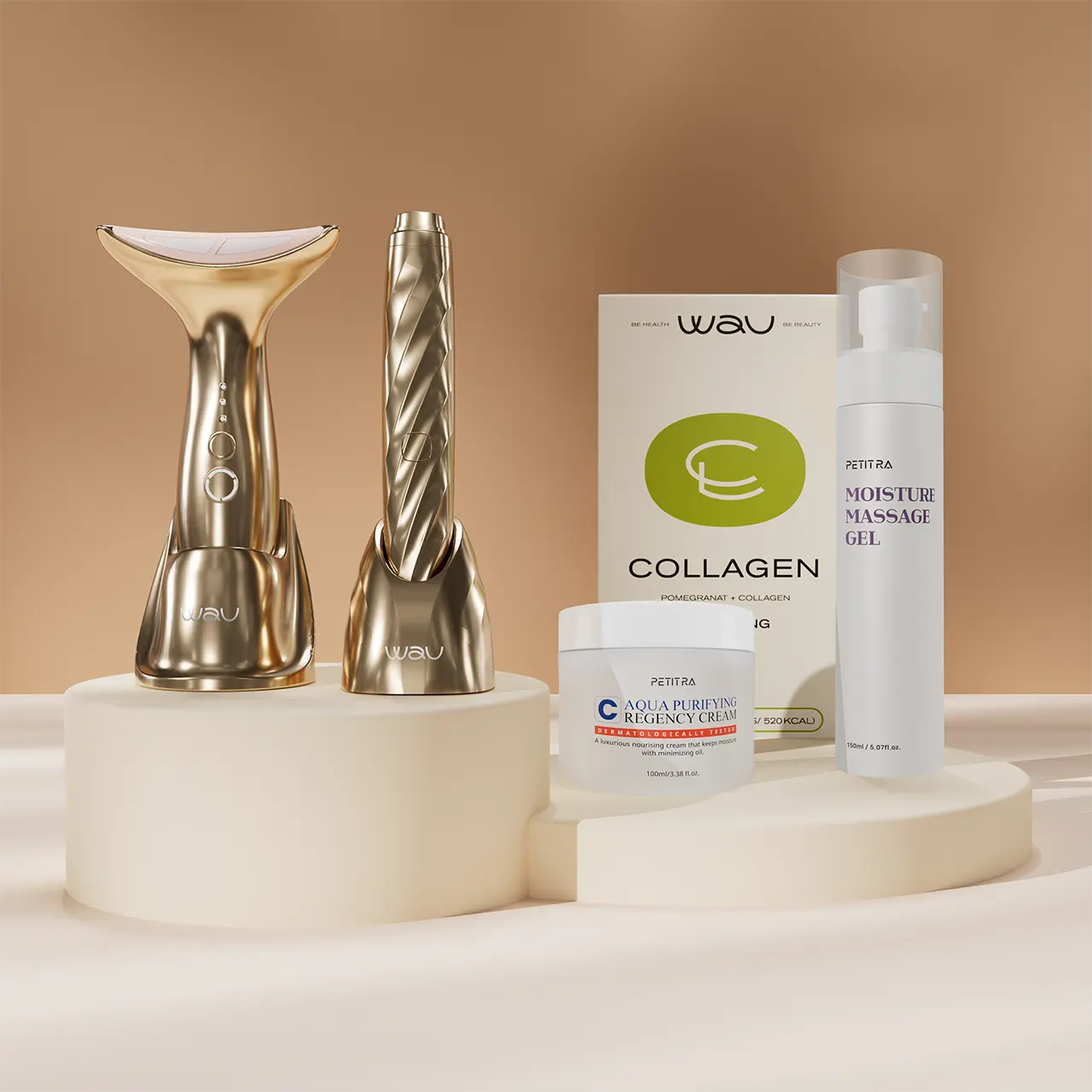 - Микротоки: стимуляция коллагена + LED-терапия: красный для омоложения, синий свет против несовершенств + вибрация: лимфодренаж