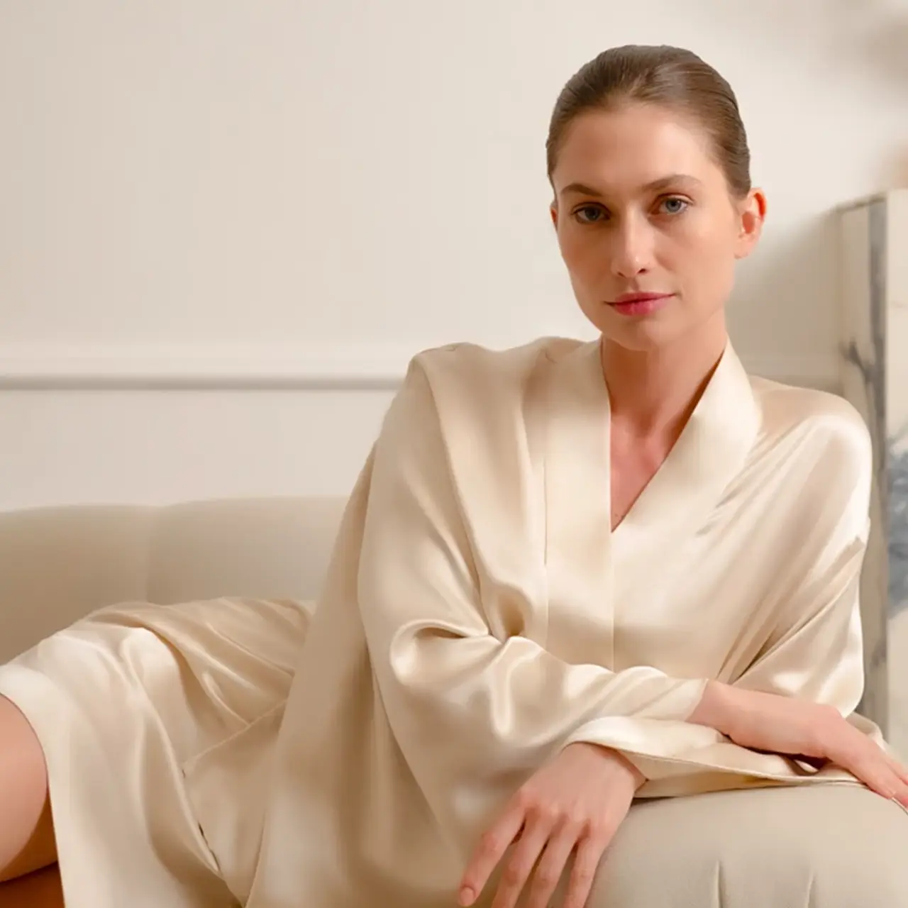 Изделия изготовлены из 100% натурального шёлка сорта Mulberry 6A плотностью 19 момми. Ткань сертифицирована по международным стандартам Oeko-Tex®, что подтверждает отсутствие химических добавок, вредных веществ и токсичных красителей