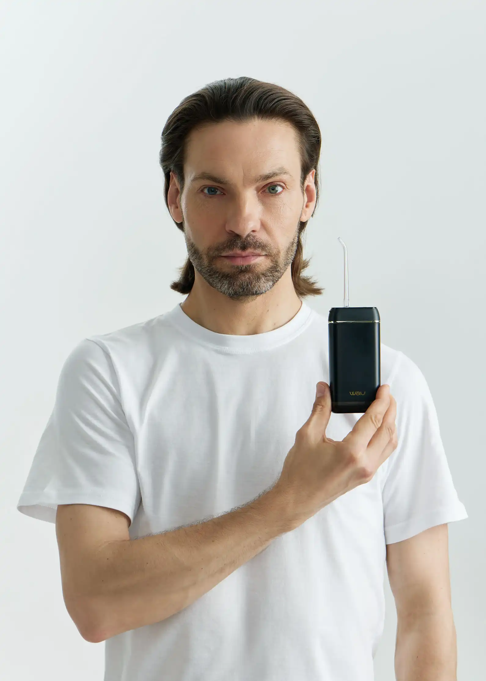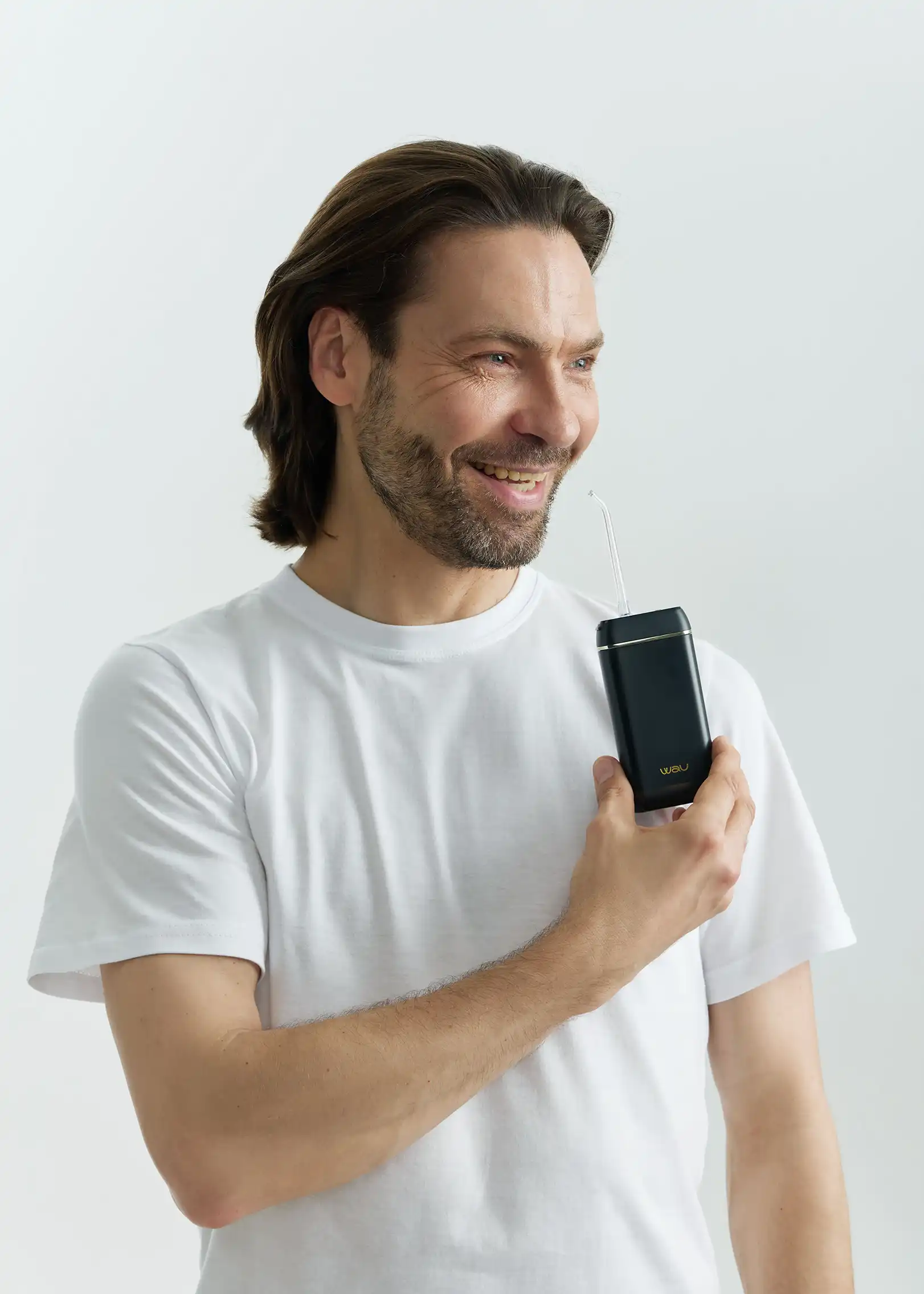 Портативный ирригатор с увеличенным резервуаром для комплексного ухода. Удаляет зубной налет, предотвращает заболевания десен и обеспечивает бережный уход за ортодонтическими конструкциями