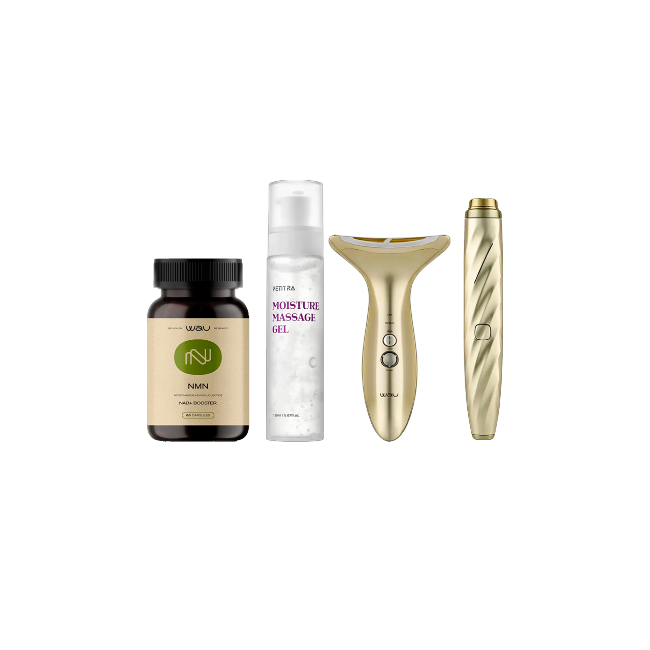 Эксклюзивная система омоложения, где каждый элемент усиливает действие другого: аппаратное воздействие на лицо и зону глаз, глубокое восстановление кожи, и замедление процессов старения изнутри