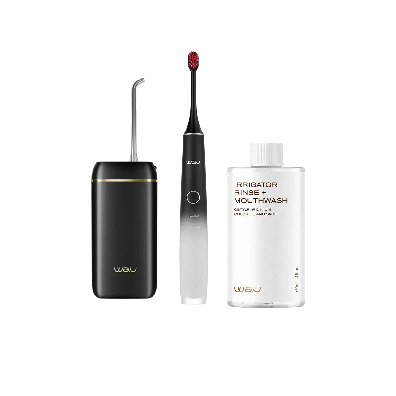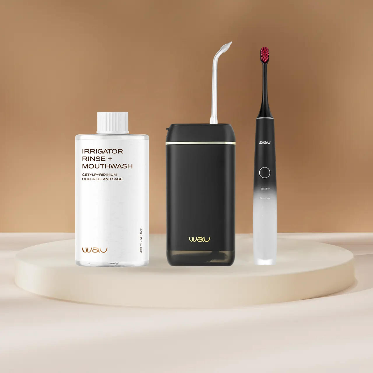 Комплект для полноценного ухода за зубами и деснами. Звуковая зубная щетка MORI BLACK удаляет налет и бактерии, а портативный ирригатор MIGA BLACK дополняет уход, очищая труднодоступные места и массируя десны, ополаскиватель улучшает состояние слизистой и препятствует развитию кариеса