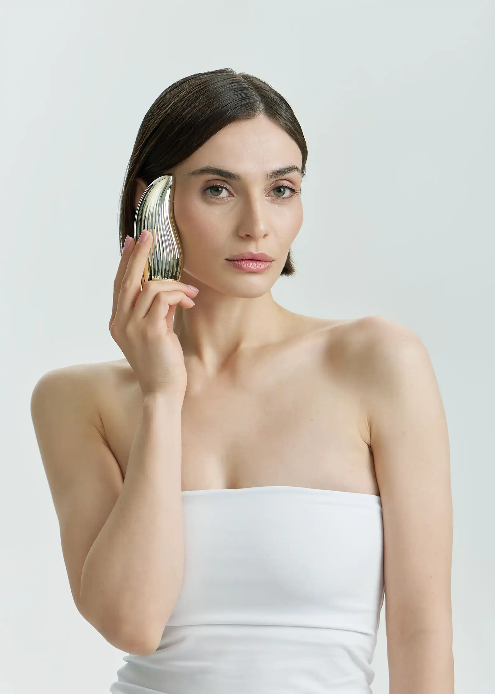 В отличие от обычных девайсов, этот массажер работает прицельно. Аппарат оснащен двумя электродами из стали, что увеличивает зону охвата. Изогнутая форма делает массажер идеальным для техники гуаша. Вы можете прорабатывать не только скулы, но и зону шеи, а также использовать массажер для тела, например, в зоне декольте.